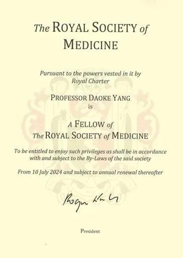 英國皇家醫(yī)學(xué)會是世界上歷史悠久、具有影響力的醫(yī)學(xué)學(xué)術(shù)組織之一,致力于推動醫(yī)學(xué)科學(xué)的發(fā)展,提升全球醫(yī)療服務(wù)水平。該學(xué)會院士頭銜授予在醫(yī)學(xué)領(lǐng)域取得了突出成就的醫(yī)師和科學(xué)家。能夠當選為英國皇家醫(yī)學(xué)會院士,是對楊道科教授學(xué)術(shù)成就和重要貢獻的高度認可。