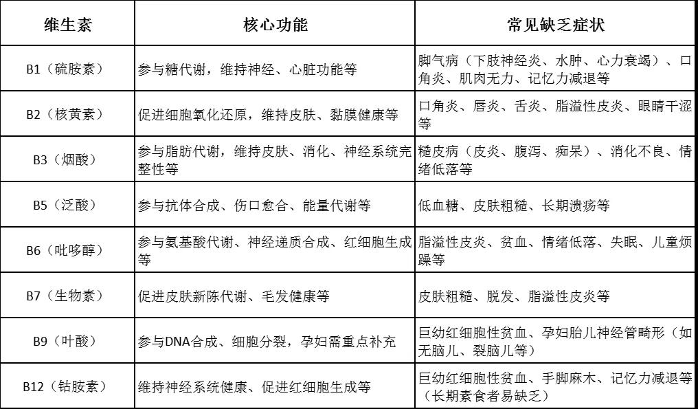 B族維生素是水溶性維生素家族,包括維生素B1(硫胺素)、B2(核黃素)、B3(煙酸)、B5(泛酸)、B6(吡哆醇)、B7(生物素)、B9(葉酸)、B12(鈷胺素)等8種人體必需成員。它們是糖、脂肪、蛋白質(zhì)代謝的關(guān)鍵輔酶構(gòu)成成分之一,參與神經(jīng)系統(tǒng)功能、皮膚健康、紅細(xì)胞生成等多個生理過程,缺乏會導(dǎo)致多系統(tǒng)疾病。