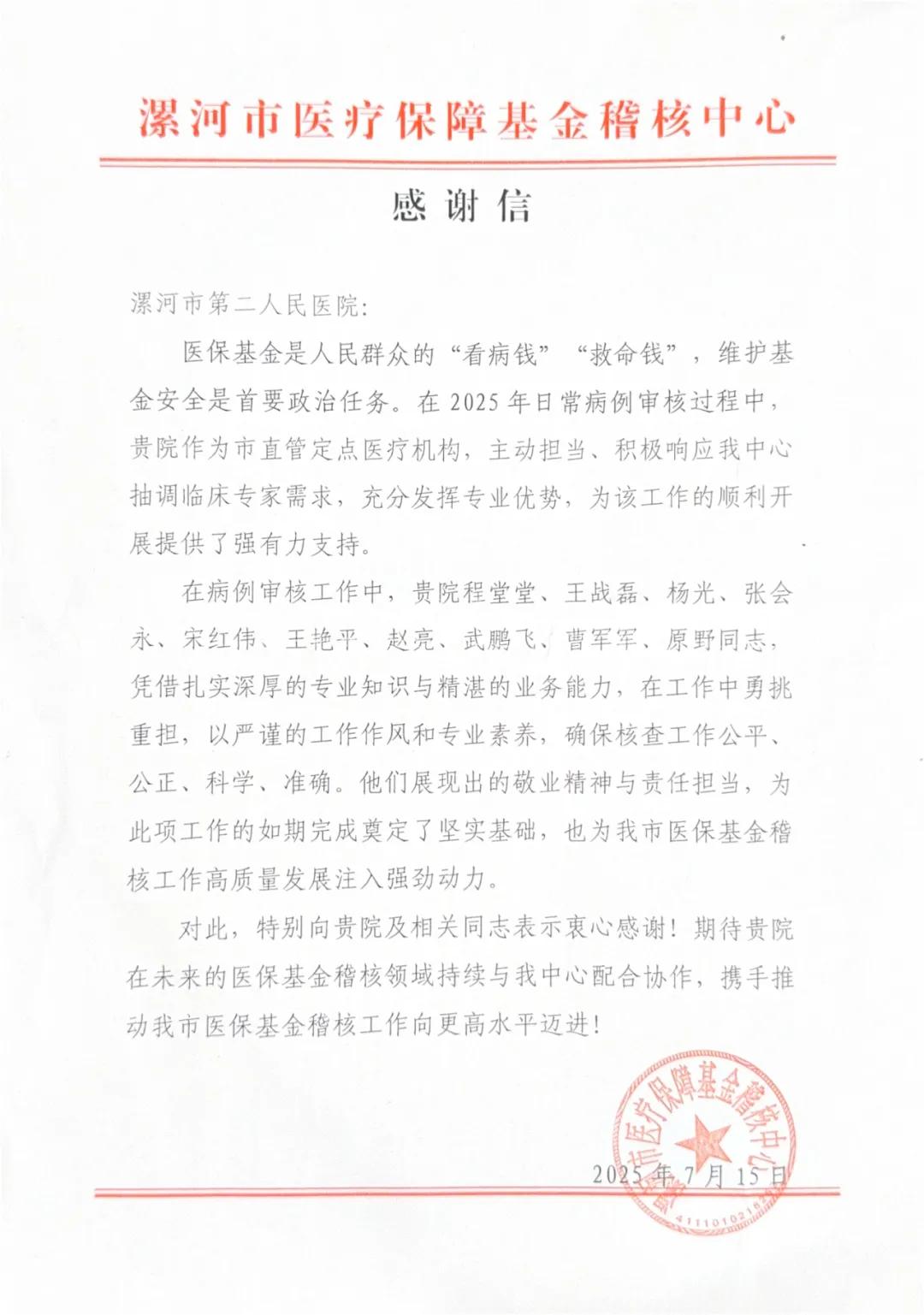 近日,市醫(yī)療保障基金稽核中心向市二院發(fā)來感謝信,對醫(yī)院選派多名業(yè)務(wù)骨干協(xié)助開展2025年日常病例審核工作表示感謝,信中高度評價市二院專家團(tuán)隊以扎實的臨床功底和嚴(yán)謹(jǐn)?shù)墓ぷ髯黠L(fēng),高效完成病例合規(guī)性審查,為醫(yī)保基金監(jiān)管提供重要技術(shù)支持,并對醫(yī)院長期以來在醫(yī)保政策落實、醫(yī)療質(zhì)量管控方面的工作成效給予充分肯定。