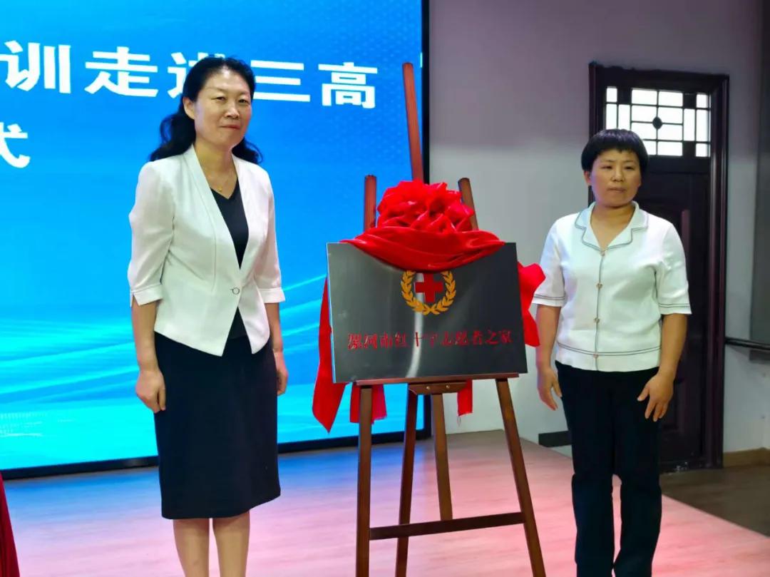 現(xiàn)場(chǎng),郭俊偉向“漯河市第三高級(jí)中學(xué)紅十字應(yīng)急救護(hù)社團(tuán)”代表授旗,孫潁華和胡海英共同為“紅十字志愿者之家”揭牌。