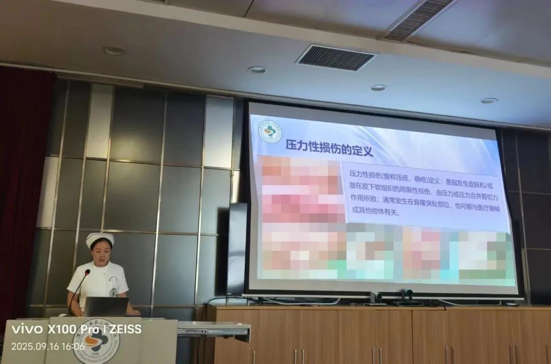 培訓伊始,壓力性損傷/傷口護理學組會診干預組長張燕燕老師帶來關(guān)于《新型敷料在壓力性損傷中的應用》的主題分享。她結(jié)合大量臨床案例,細致講解了各類新型敷料的材質(zhì)特性、適用場景,以及壓力性損傷不同分期對應的敷料選擇策略、操作規(guī)范和效果評估方法。從水膠體敷料到泡沫敷料,從藻酸鹽敷料到銀離子敷料,張老師一一剖析,讓參訓人員對新型敷料的臨床應用有了更精準、全面的認識,為科學選擇和使用敷料提供了堅實理論支撐。