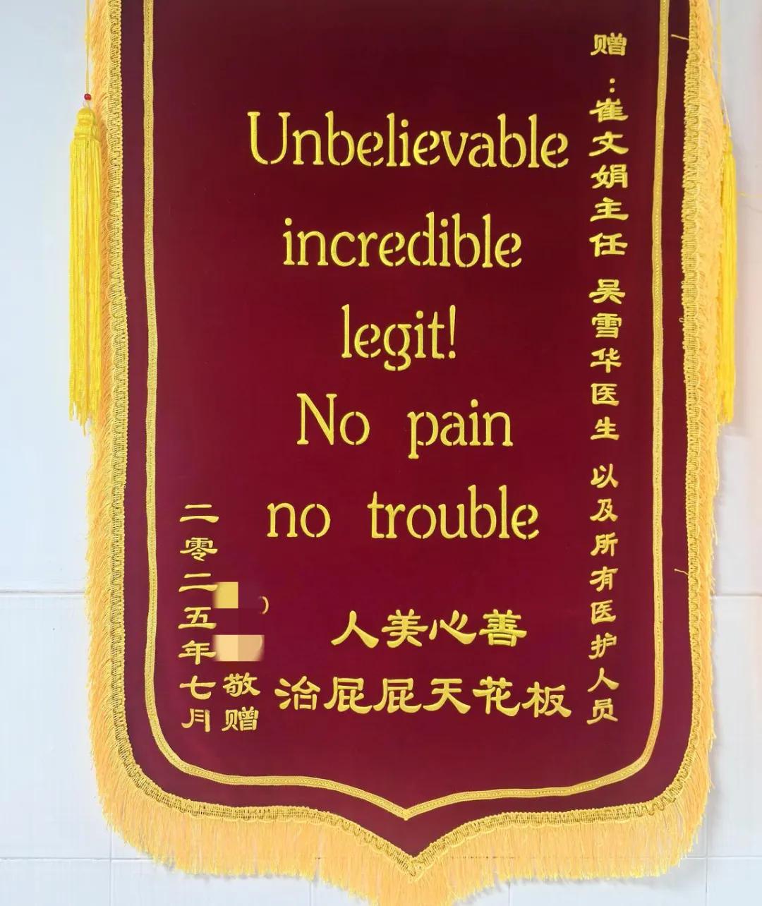 熟悉肛腸科的人都知道,這里時常因患者的 “巧思” 充滿歡樂,近期科室就接連收到了好幾面別具一格的錦旗。其中一面寫著 “Unbelievable incredible legit!No pain no trouble 人美心善 治屁屁天花板”,中西結(jié)合的表達(dá)既俏皮又真誠;還有一面則用 “手術(shù)不疼換藥不疼,肛好有你高水平!” 的諧音巧語傳遞謝意。這些充滿趣味的錦旗文字,從側(cè)面印證了肛腸科在創(chuàng)面疼痛管理方面取得了良好成效,也是患者對我們診療服務(wù)的肯定認(rèn)可。