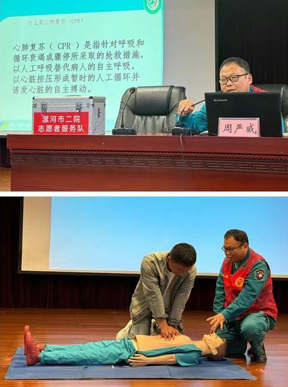 隨后,急診科副主任醫(yī)師周嚴威圍繞《應(yīng)急急救技能實操》進行專題講解與現(xiàn)場演示,重點聚焦海姆立克急救法與心肺復(fù)蘇術(shù)兩大關(guān)鍵技能。為讓職工更直觀掌握動作要領(lǐng),周嚴威副主任醫(yī)師使用人體模型進行多輪演示,同時邀請現(xiàn)場職工上臺實操練習,確保每位參與實操的職工都能規(guī)范掌握核心步驟。