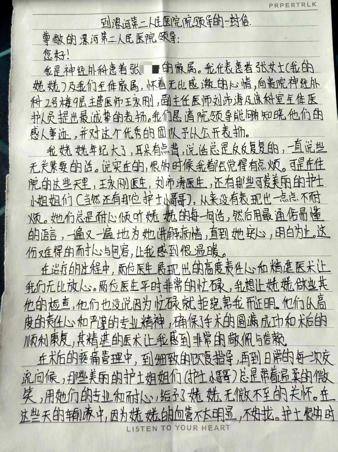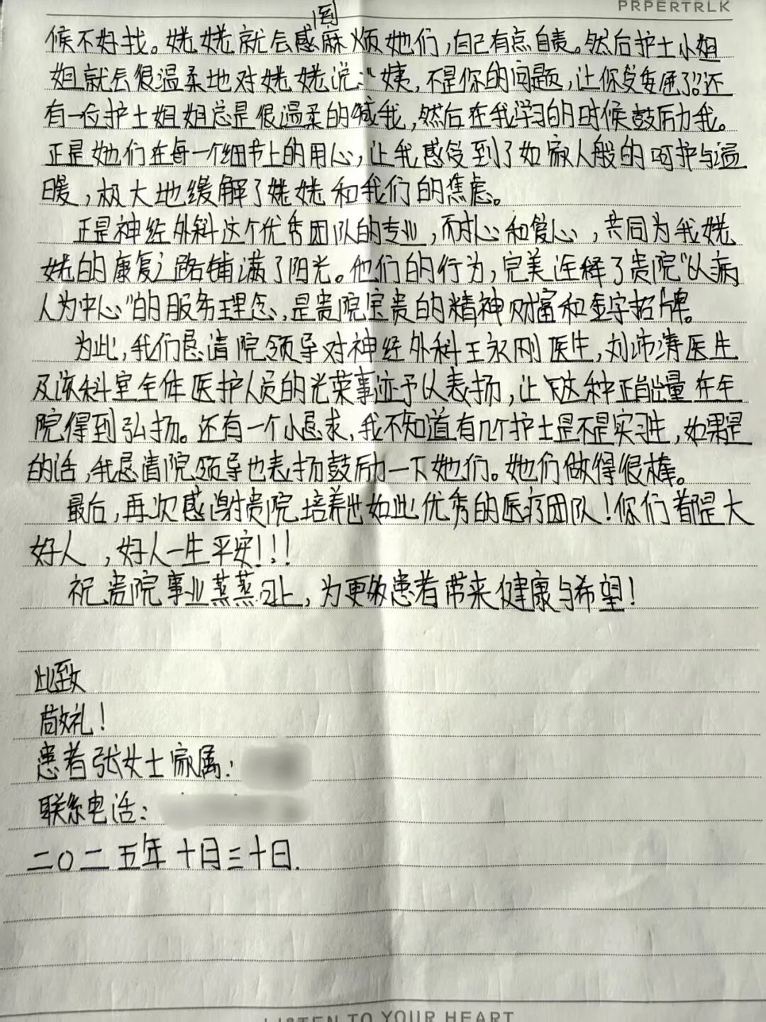 據(jù)了解,張女士的姥姥因“背部腫物”一直備受困擾,6年前在其他醫(yī)院手術(shù)治療后效果不佳,1年內(nèi)復(fù)發(fā),腫物逐漸增大,并出現(xiàn)肩部活動受限伴肩部疼痛。來到市二院后神經(jīng)外科醫(yī)生立即進行手術(shù),因術(shù)中腫物與周圍組織粘連嚴(yán)重,手術(shù)歷時近2個小時,術(shù)后恢復(fù)良好。“我的姥姥年紀(jì)大了,耳朵有點背,說話總是反反復(fù)復(fù),啰啰嗦嗦的。說實在的,有時候我都會覺得有點煩??墒菑淖≡阂詠?,劉沛濤主任、王永剛醫(yī)生,還有那些美麗可愛的護士小姐姐們和帥氣的護士小哥哥,從來沒有表現(xiàn)出一點點不耐煩。他們總是耐心地聽姥姥講,一遍遍地解釋給她聽,直到她聽懂為止。”張女士的表揚信中字里行間包含著對神經(jīng)外科整個醫(yī)護團隊暖心服務(wù)的認(rèn)可與贊美。