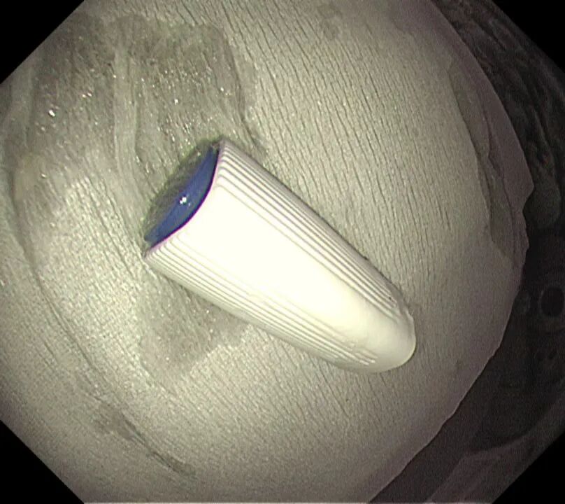 時間不等人,雖已臨近晚7點,市二院第一時間啟動應(yīng)急響應(yīng)機制,內(nèi)鏡室、麻醉科醫(yī)護技立即返崗就位,并經(jīng)院辦等職能部門積極協(xié)調(diào),盡可能縮短術(shù)前準備時間,迅速制定了取出異物的方案。隨后,在全身麻醉下,朗朗安然入睡,醫(yī)生通過纖細的胃鏡,精準地找到了那個“惹事”的筆帽位于十二指腸內(nèi),并順利將其取出。整個過程僅用時十幾分鐘,朗朗術(shù)后很快蘇醒,觀察無礙后平安回家。