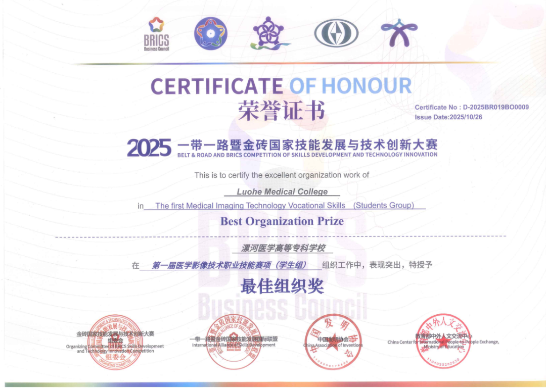教師團隊亦表現(xiàn)不俗,孫英杰老師在“醫(yī)學影像教學創(chuàng)新賽項”中獲三等獎,王海波、劉曉梅、丁琦峰三位老師因在賽前指導中表現(xiàn)突出,被授予“優(yōu)秀指導教師”稱號。尤為值得一提的是,周山主任及其帶教團隊因組織有序、動員充分、師生整體表現(xiàn)優(yōu)異,被大賽組委會授予“最佳組織獎”——這也是繼2025年9月第十二屆“泰山杯”全國醫(yī)學影像技術(shù)專業(yè)大學生實踐技能大賽以來,漯河醫(yī)專二附院醫(yī)學影像教學團隊又一次參加此項全國性的醫(yī)學影像技術(shù)專業(yè)實踐技能大賽的優(yōu)異成績。