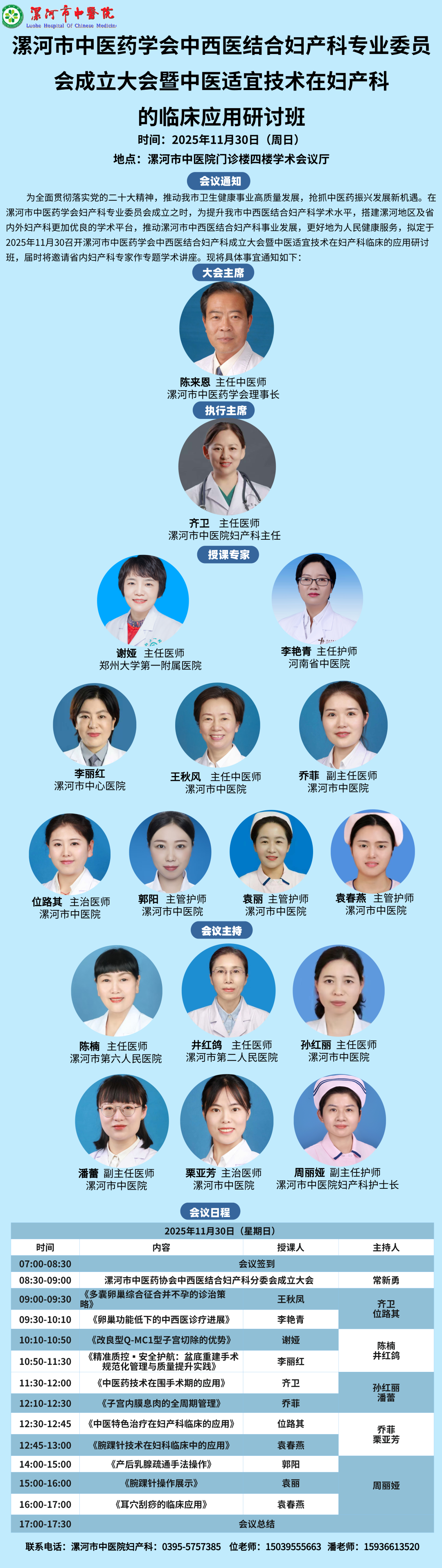 【學(xué)術(shù)通知】11月30日,漯河市中醫(yī)藥學(xué)會(huì)中西醫(yī)結(jié)合婦產(chǎn)科專業(yè)委員會(huì)成立大會(huì)暨中醫(yī)適宜技術(shù)在婦產(chǎn)科的臨床應(yīng)用研討班
