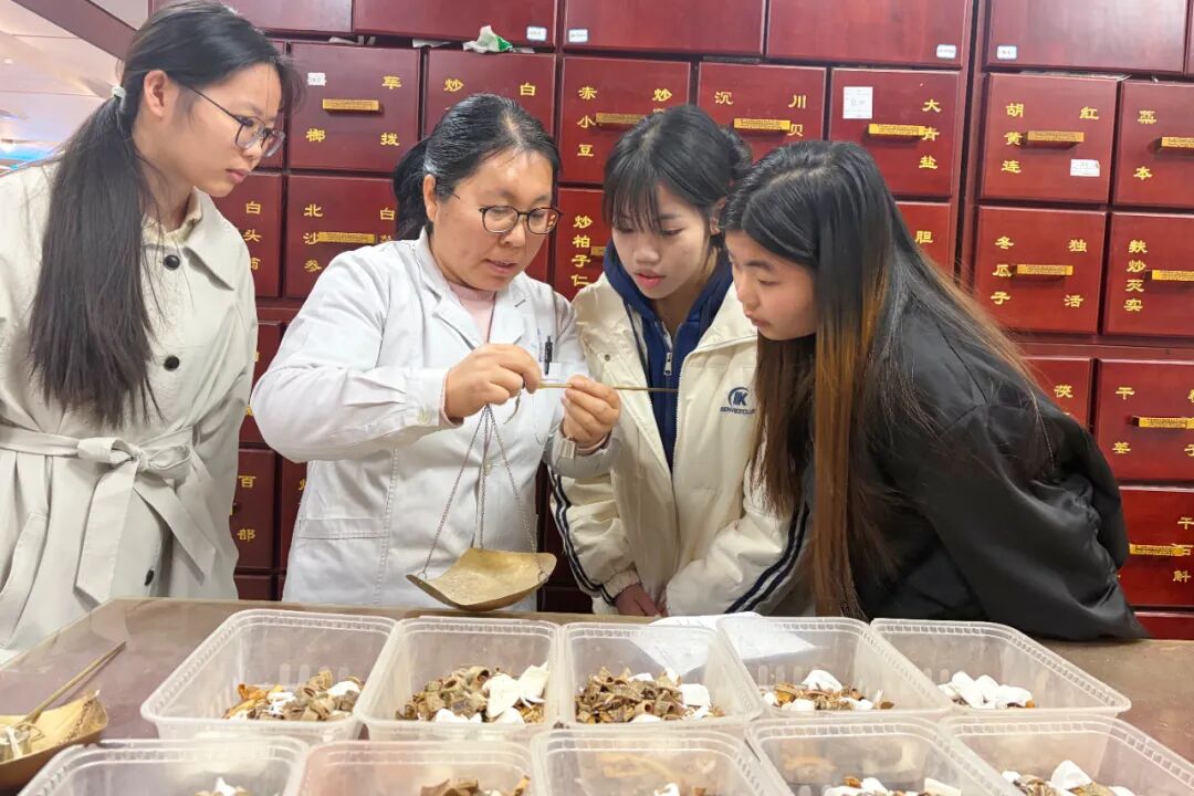 在市中醫(yī)院藥學(xué)部副主任白冰、陳志軍陪同下,師生們先后走進(jìn)精品藥房、散裝飲片藥房、西藥房、制劑藥房、藥庫及臨床藥學(xué)室。從貴細(xì)藥材的鑒別儲存、“戥子稱量”的傳統(tǒng)技藝,到現(xiàn)代化藥房的高效管理、臨床藥師的一線用藥案例,同學(xué)們沉浸式感受了從傳統(tǒng)中醫(yī)藥到現(xiàn)代藥學(xué)服務(wù)的魅力。