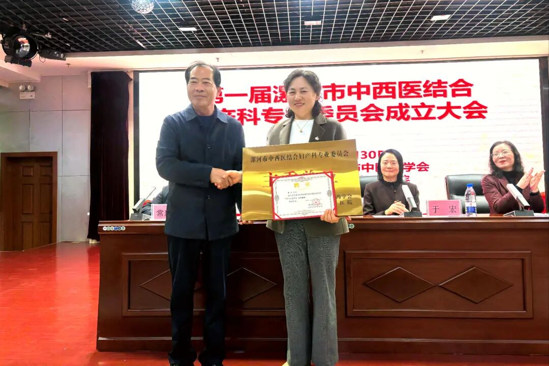 漯河市中醫(yī)藥學(xué)會理事長陳來恩為漯河市中醫(yī)藥學(xué)會中西醫(yī)結(jié)合婦產(chǎn)科專業(yè)委員會的成立揭牌并給本次大會主任委員齊衛(wèi)頒發(fā)聘書。