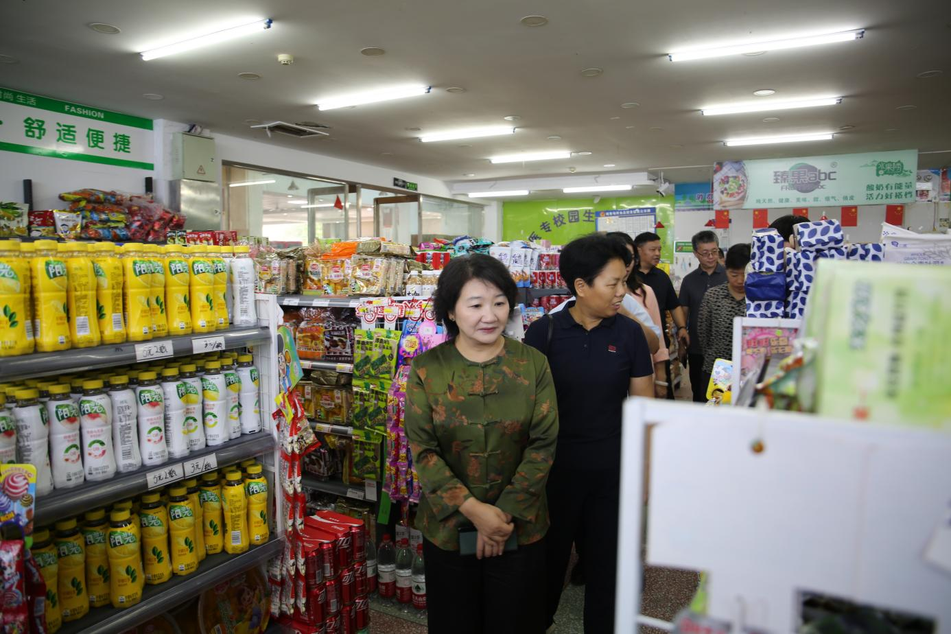 校長(zhǎng)張祎捷在超市檢查商品供應(yīng)等情況