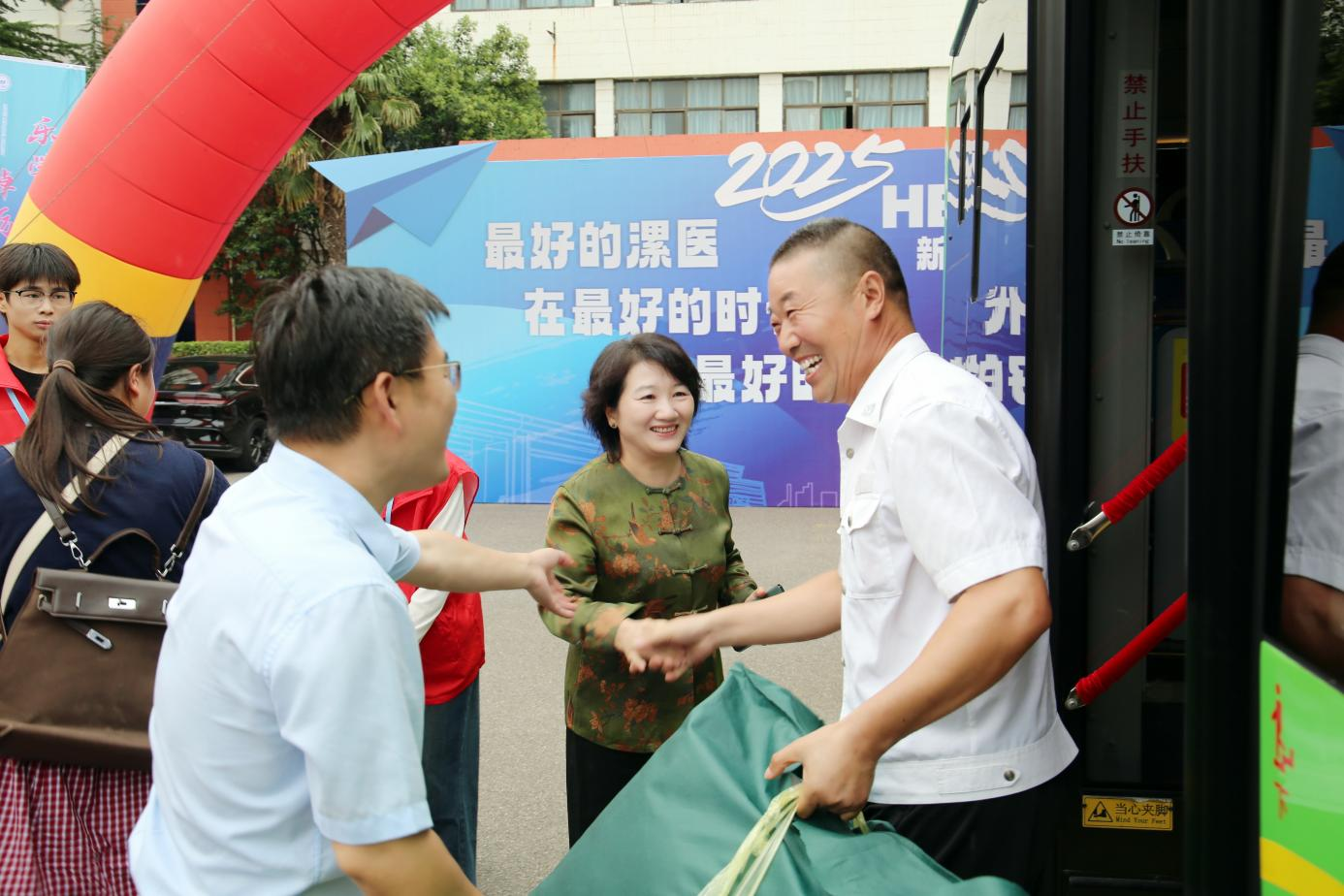 青春乘秋風(fēng),壯志啟新程。8月30日,漯河醫(yī)專迎新工作全面拉開帷幕,上午8時(shí),校長(zhǎng)張祎捷、校黨委副書記邊曉峰分別帶領(lǐng)校領(lǐng)導(dǎo)班子深入源匯校區(qū)、召陵校區(qū)迎新現(xiàn)場(chǎng),迎接第一輛駛?cè)胄@的新生班車,親切看望2025級(jí)新生及家長(zhǎng),并慰問一線工作人員和志愿者。