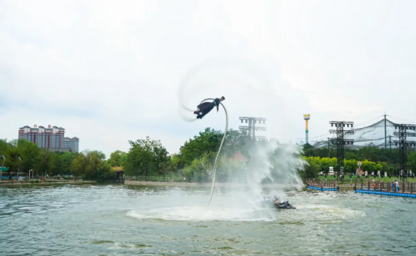 水上表演更是精彩絕倫?!丢?dú)竹水上漂》節(jié)目中,表演者們腳踩楠竹,在水面上輕盈滑行,仿佛在水上飛舞,引得觀眾們驚嘆不已。《水上飛人》的表演者們借助噴水裝置在空中翻轉(zhuǎn)騰挪,如同超人般翱翔于水面之上;而《水上火壺》則將傳統(tǒng)藝術(shù)與現(xiàn)代科技完美結(jié)合,火光與水花交相輝映,震撼的視覺(jué)效果讓觀眾們?nèi)滩蛔“l(fā)出陣陣喝彩和尖叫。鳳棲湖劇場(chǎng)內(nèi),大型舞臺(tái)劇《時(shí)空奇緣》的現(xiàn)場(chǎng)排練預(yù)演同樣精彩,演員們精湛的表演和動(dòng)人的故事引得觀眾掌聲雷動(dòng),沉浸其中。