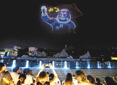 8月21日晚8時許,千架無人機在河上街景區(qū)騰空而起,瞬間點亮夜空。火箭、身著航天服在太空漫步的宇航員、繞地球飛行的天宮空間站……當晚的千機飛“只有漯河”展演活動,以“太空之旅”為主題,吸引了眾多市民和游客。記者看到,市民、游客紛紛舉起手機、相機,定格精彩瞬間(如圖)。