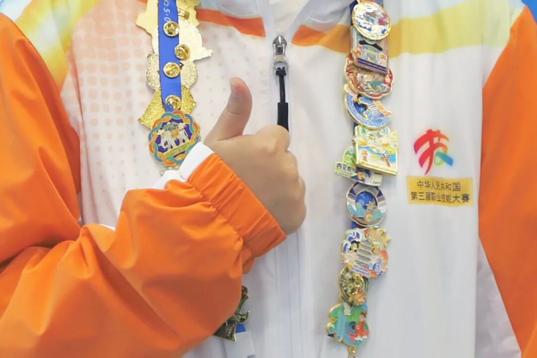 在中華人民共和國第三屆職業(yè)技能大賽現(xiàn)場,一枚紅金輝映、造型典雅的賽事徽章成功“搶鏡”,出現(xiàn)“一章難求”的爆火景觀,掀起“換pin”熱潮(換pin:大型賽事中交換徽章的活動)。它就是由漯河技師學院平面設計專業(yè)教師閆莉自主設計的第三屆全國技能大賽限定徽章——河南。