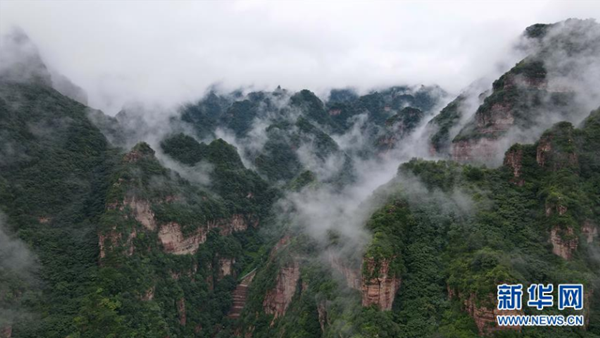 8月15日拍攝的紫金山景區(qū)(無人機(jī)照片)。 當(dāng)日,位于河北省邢臺市西部太行山脈的紫金山景區(qū)云霧彌漫,美景如畫。 新華社記者 牟宇 攝